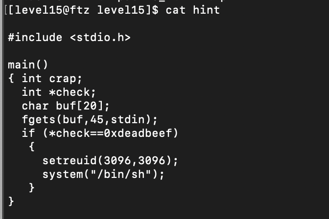 check 포인터 자리에 deadbeef 문자열이 들어있는 주소가 오도록 오버플로우 시키는 방법이다.