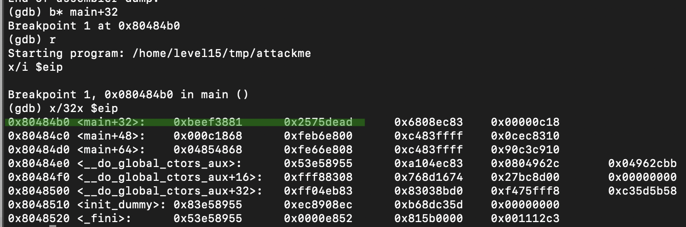 deadbeef 문자열이 담긴 주소 0x80484b2 를 알아낼 수 있다.