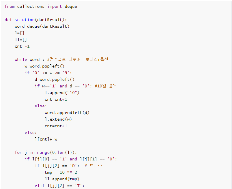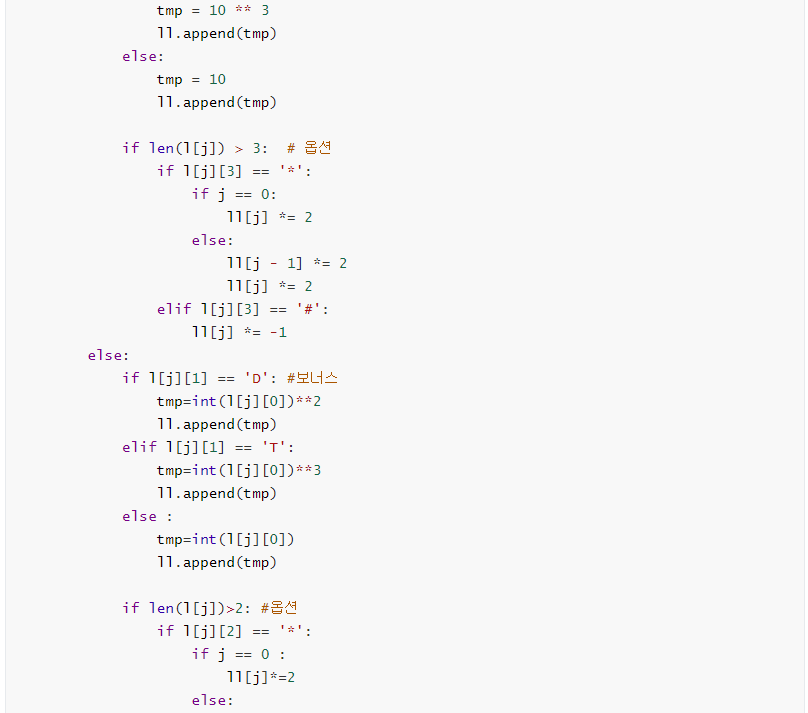 정규 표현식을 활용해 정수 부분, 보너스 부분, 옵션 부분을 나누고 이 셋을 묶어 리스트의 원소로 추가하여 소스를 짠 예시이다.