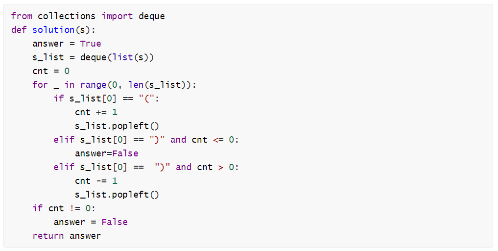 '(' 과 ')' 쌍이 이루어져야하기 때문에 ')' 로 시작하는데 '(' 과의 개수가 동일하거나 작으면 우선 False 출력.