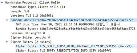 c 1) TLS 버전, 암호 알고리즘 목록 (cipher suites), client random 전송