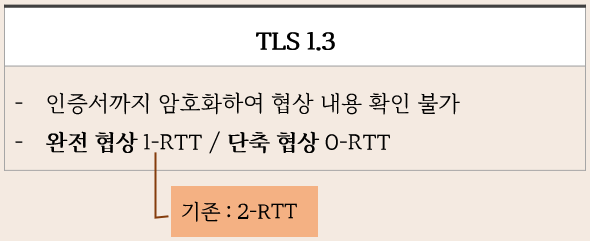 완전 협상에서는 전체 Handshake 과정이 기존 2-RTT 에서 1-RTT 로 단축되어 연결 속도가 향상되었다.