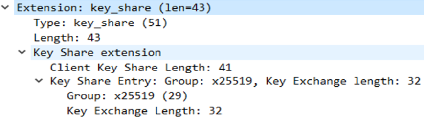 키 교환 알고리즘에서 RSA 가 배제되어 옵션이 매우 축소된 클라이언트는 시작부터 D-H를 사용한다고 가정할 수 있기 때문에,(물론 D-H도 x25519 등의 여러 방식이 존재하지만 이전보다 추측이 쉬워진 것)암호화 및 키 교환 방식 모두에서 줄어든 경우의 수를 Client Hello 에서 한번에 전송한다. 이게 바로 key_share 에 해당한다.