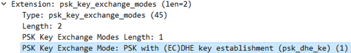 클라이언트의 psk_key_exchange_modes 확장 필드는, 이 필드 내 적힌 모드에서만 psk 사용을 지원한다는 의미로,클라이언트가 pre_shared_key 필드를 psk 키 협상을 위해 전송할 경우, 이 확장 필드도 반드시 같이 제공해야한다.