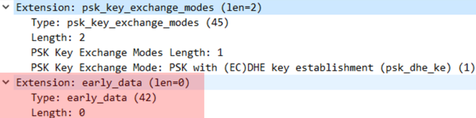 1-RTT 와 Handshake 과정에서 보이는 차이는 Client Hello내 확장 필드로 존재하는 early_data 의 유무이다.
