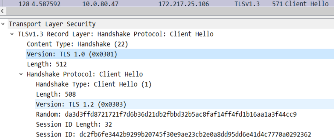 또한 TLS1.3은 16진수 0x0304로 표기되며, suppoerd_versions 필드에 지원 가능한 모든 TLS 버전이 표기되며