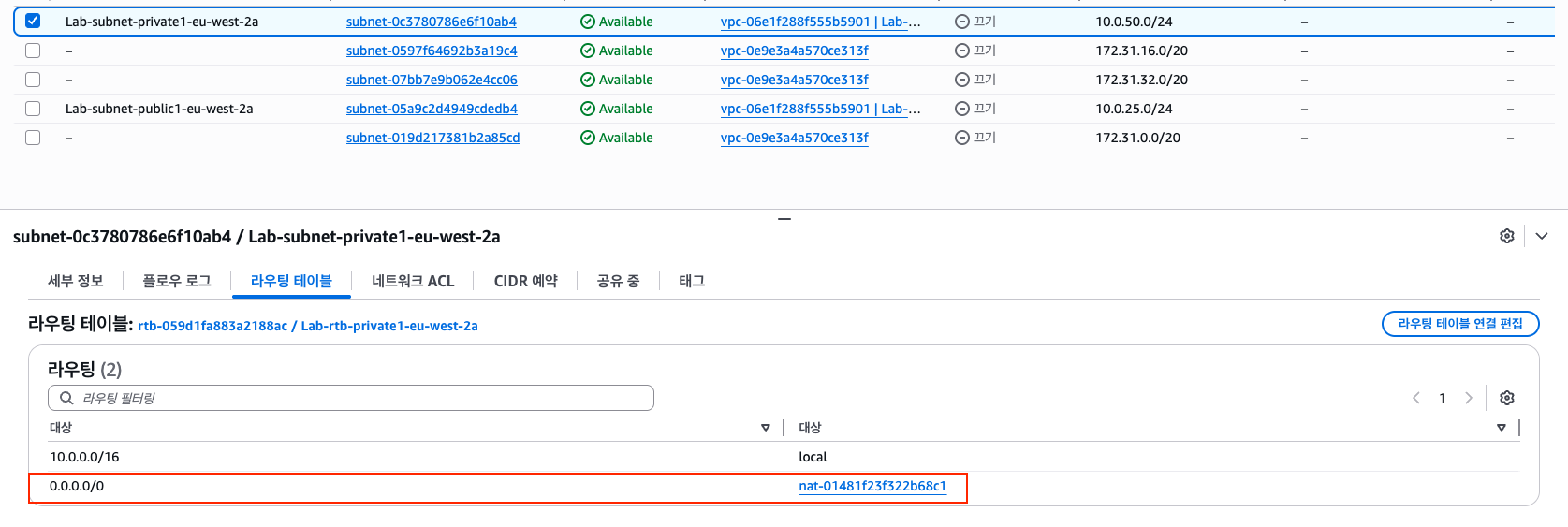 - 프라이빗 서브넷의 경우, 다음과 같이 0.0.0.0/0 -> nat