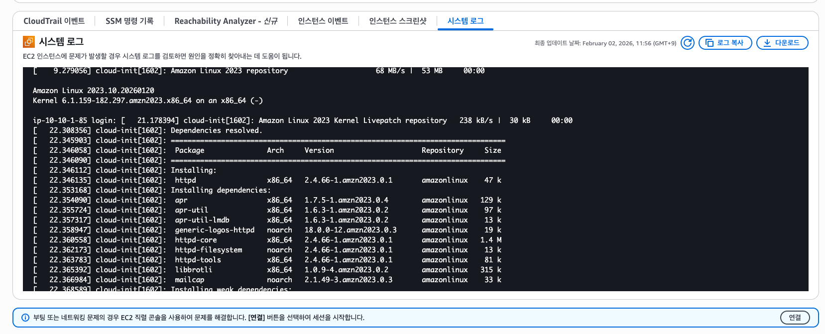 - ssh 또는 rdp 로 인스턴스 연결 불가할 경우 이미지로 확인 가능