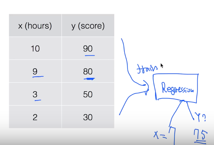 1) regression: 0~100 등의 일정 범위(ex. 시험 점수 예측 등)