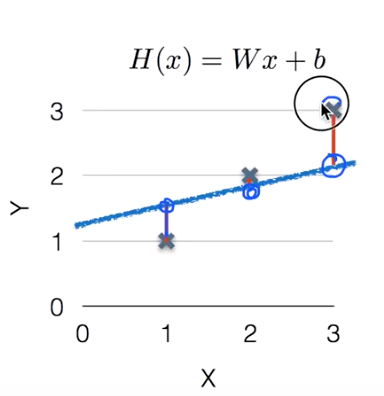 : 여기서 cost 의 최소값을 가지게 하는 W 와 b 를 구하는 것이 Linear regression 의 학습이자 목표