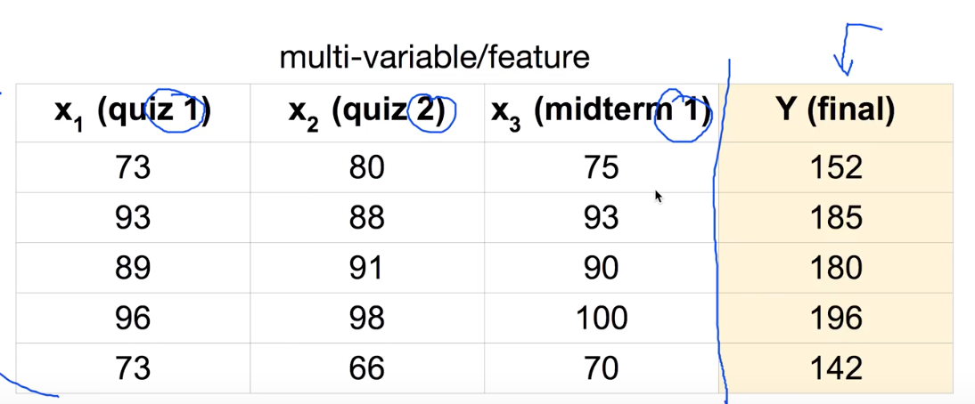 ex> 시험을 보는데 시험1,2,3 의 결과를 가지고 final 시험 점수를 예측(input 3개)
