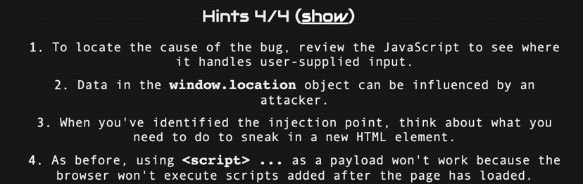 이번에도 <script> 태그는 막혔다는 내용과, window.location을 사용하라는 듯한 힌트가 주어졌다.