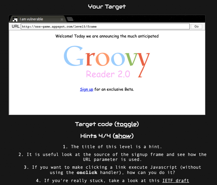 http://xss-game.appspot.com/level5/frame/signup?next=javascript:alert('1');