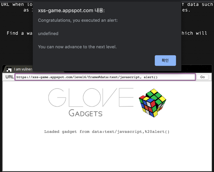 따라서 Data URL Scheme 를 사용할 경우, url 의 # 뒤에data:text/javascript, alert() 를 입력하면