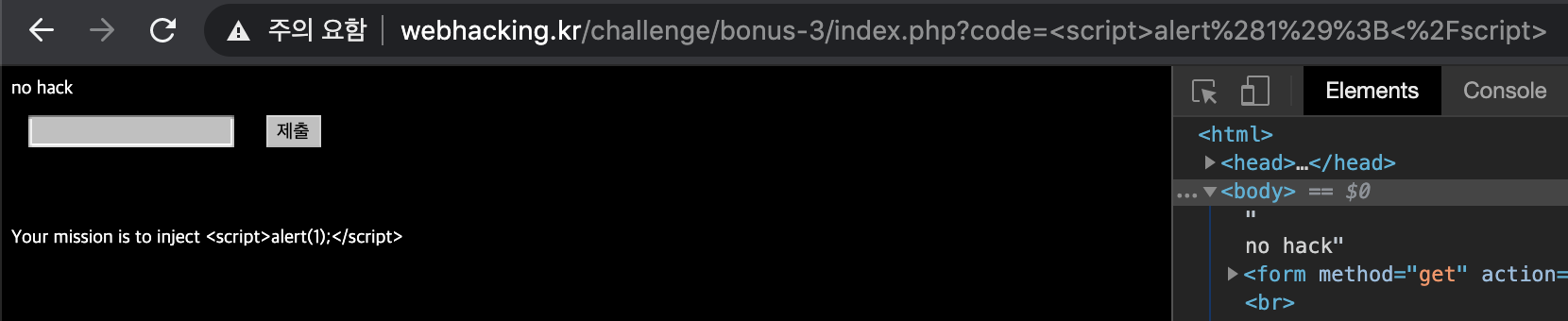 먼저 그냥 <script>alert(1);</script> 를 입력해보니 no hack 이 뜨면서 url 에 내가 입력한 값이 나왔다.