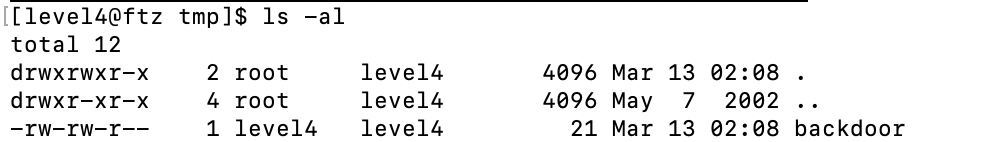 즉, /home/level4/tmp 아래에 backdoor 를 level5 의 권한으로 실행시키는 것이기 때문에,