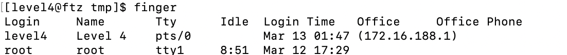 level5 유저로 원격접속하여 인터넷으로의 접근이라는 조건을 충족한 후 finger 서비스 호출로