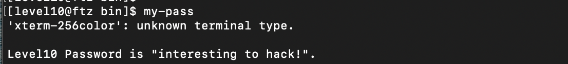 이제 따진 level10 의 쉘을 이용해서 my-pass 를 확인하자.