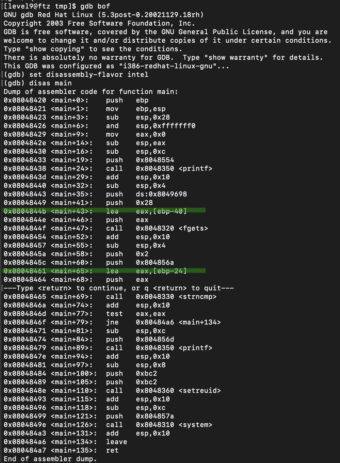 0x0848461 <main+65>: lea eax, [ebp-24] 가 buf 의 주소가 될 것이다.