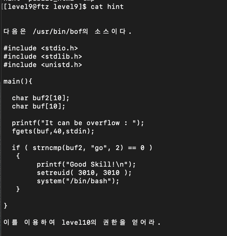 그리고 system("/bin/bash") 를 실행하는 즉, level10 권한으로 쉘을 여는 부분이 실행되려면,